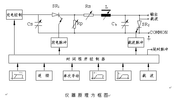 仪器内部有一个直流稳压源提供给主回路充电电容Cs一个稳定的充电电容,其值可以从0~400V连续调节,放电时间是由时间控制器输出给可控硅一个触发信号,这样在放电回路里得到一个冲击脉冲波形。脉冲的频率是由时间控制器控制,当外接充电电容Cs时,其频率在3Hz,需要单次手动时,由手动开关控制,接一下开关输出一个脉冲,使用内接充电电容时脉冲频率为250Hz,时间控制器频率是由工频电源的频率分频后产生的,所以频率稳定便于通用示波器测试。